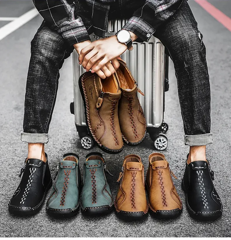 🔥Last Day Promotion 70% OFF🔥Men's Handcrafted Ankle Boots - Vintage Style, Green Stitched, Rubber Sole, Round Toe, All-Season Casual Shoes